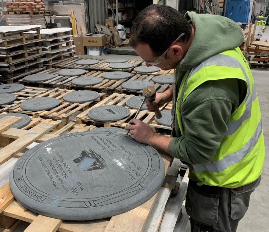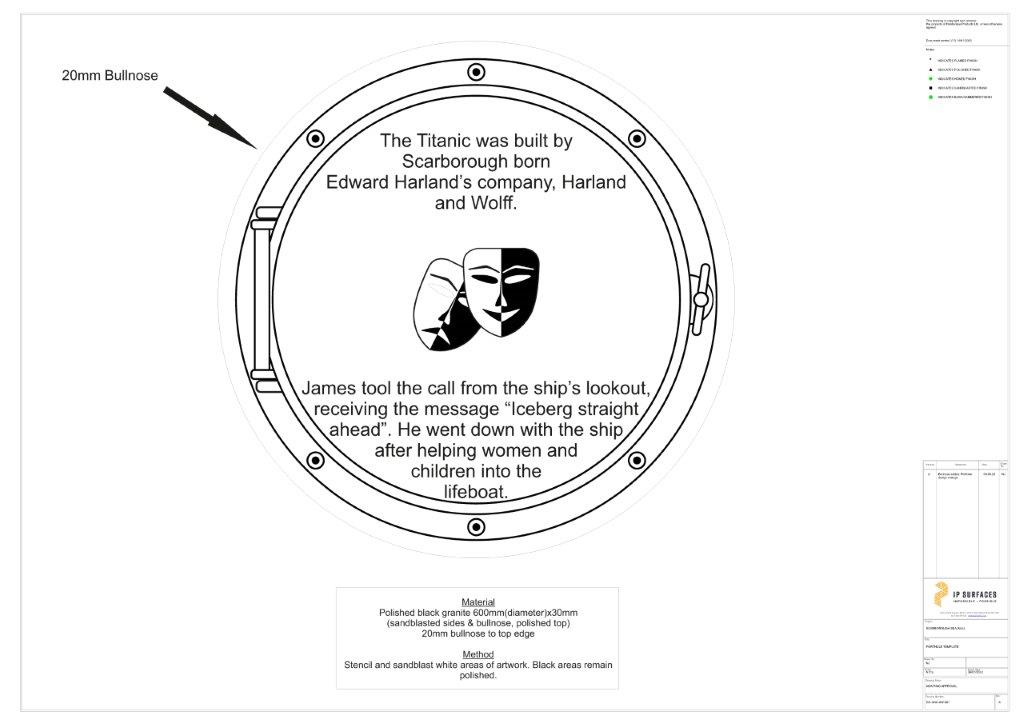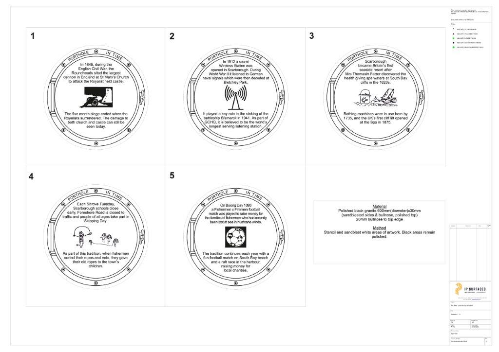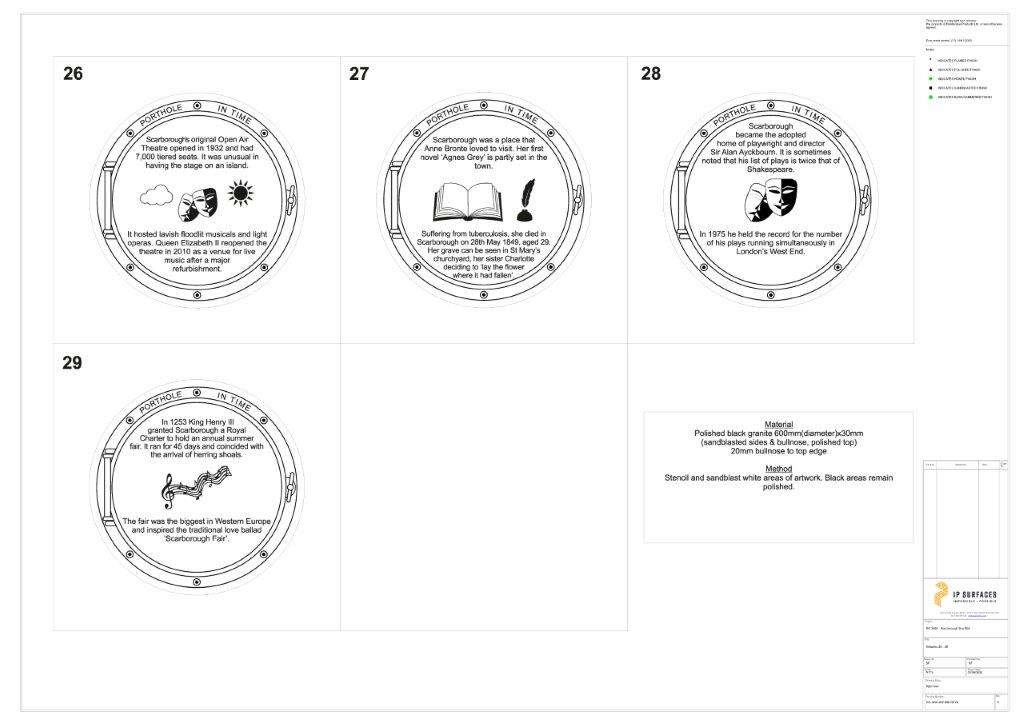 Located on the sea wall, the trail of a series of installed 31 polished black granite Storyboards along Scarborough’s Marine Drive, manufactured for the Scarborough Maritime Heritage Centre, tells the story of Scarborough’s history. The idea for the project came about from the Scarborough Maritime Heritage Centre in 2019, and were consequently awarded £40,000 by the National Lottery Heritage Fund at the start of 2022. Also involved with the project was the Archaeological and Historical Society and the Scarborough & District Civic Society with permission to use the sea wall given by Scarborough Borough Council. Each ‘Porthole in Time’ tells a small part of Scarborough’s rich and varied history. People walking the trail can learn more via a smartphone ‘App’ or website to get more details on each of the Portholes. Local residents and visitors, together with students from local schools, helped select the historical topics to feature in the project. IP Surfaces collated all of the original designs and artwork, collaborating closely with Scarborough Maritime Heritage Centre, and reproduced them for their CNC production techniques of reverse etching and sandblasting the Premium Black granite polished portholes including meticulous hand-crafted attention to detail by the IP Surfaces team. Project Manager, Huw Roberts, a Trustee of the Scarborough Maritime Heritage Centre, commented at the time of installation: “This is great news for Scarborough, and its residents and visitors. Whatever was happening in history, ancient or modern, Scarborough has been up there making the news and contributing to one of the most fascinating and unique heritages of any town in Britain.” The trail of the 31 information portholes was installed in November 2022 and inaugurated by local award-winning playwright Sir Alan Ayckbourn on 6th December 2022.