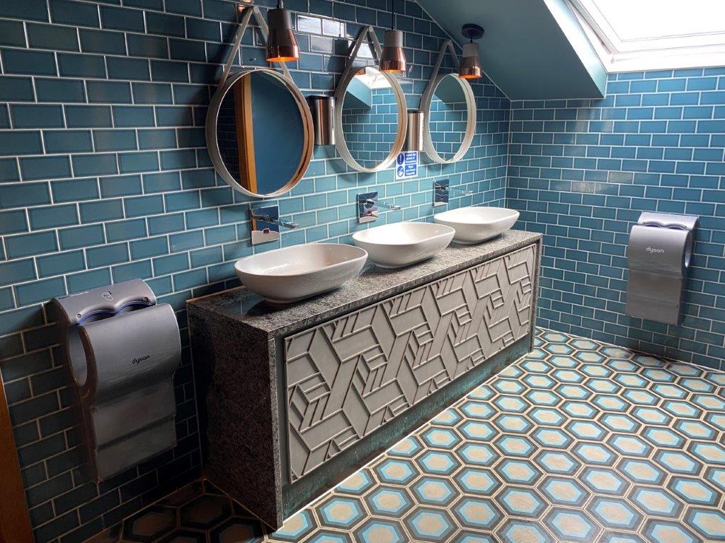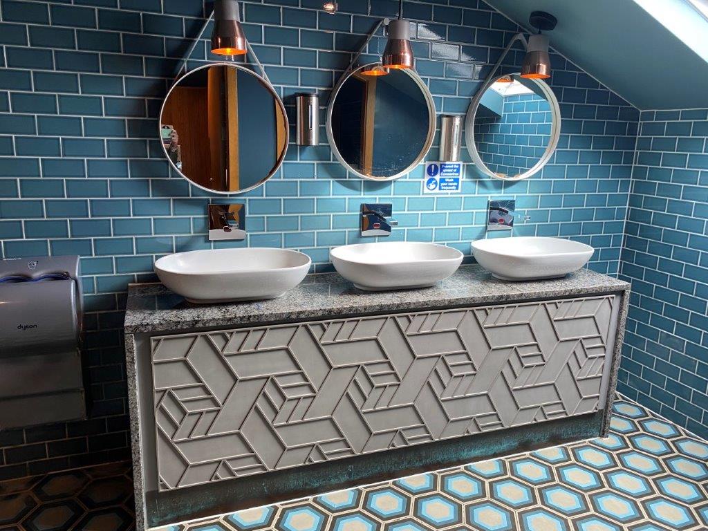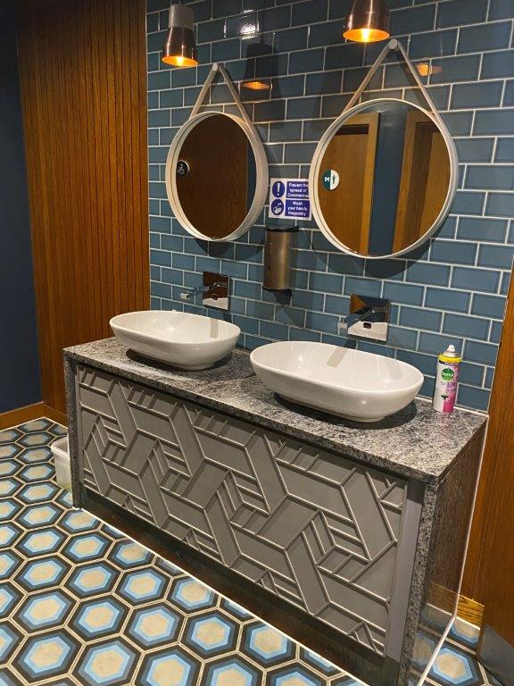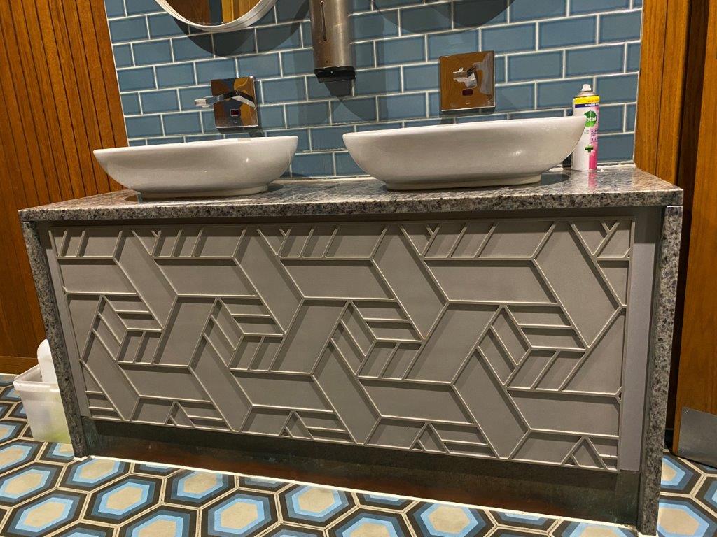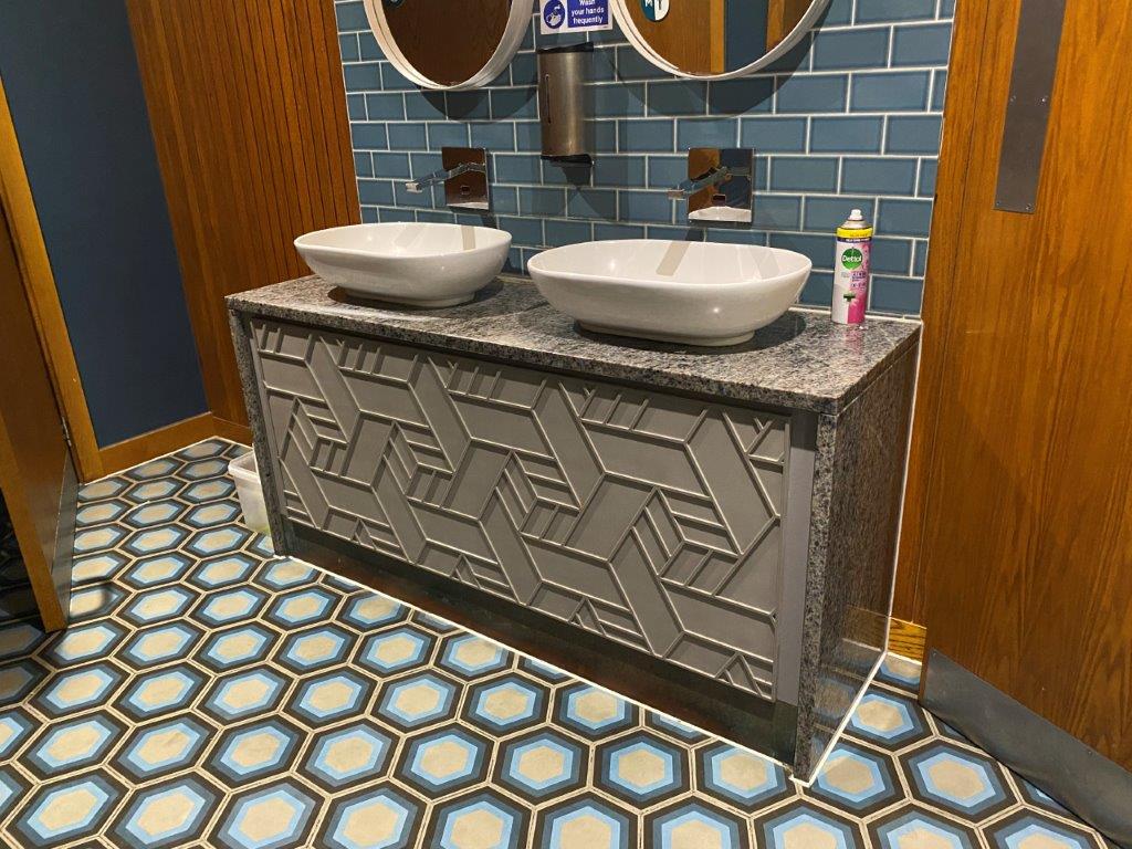 Interiors and branding expert Anna Stanton from Stanton Design came to our Stand at the Surface Design Show in 2022 and spotted a specific sample we had on display which was a carved pattern in Solid Surface Hi-Macs. The timing proved to be excellent as she was designing a new restaurant for GOKYUZU LIMITED in Finchley – a Turkish restaurant which is expanding to several locations in London with Finchley being the latest location. Anna loved the patterns which inspired her to design something unique to complement the chosen materials in the washrooms of the Finchley restaurant. We believe the whole restaurant design is amazing and a testament to Anna’s interior design creativity and talent. The fit out was undertaken by specialists View Interiors Ltd.