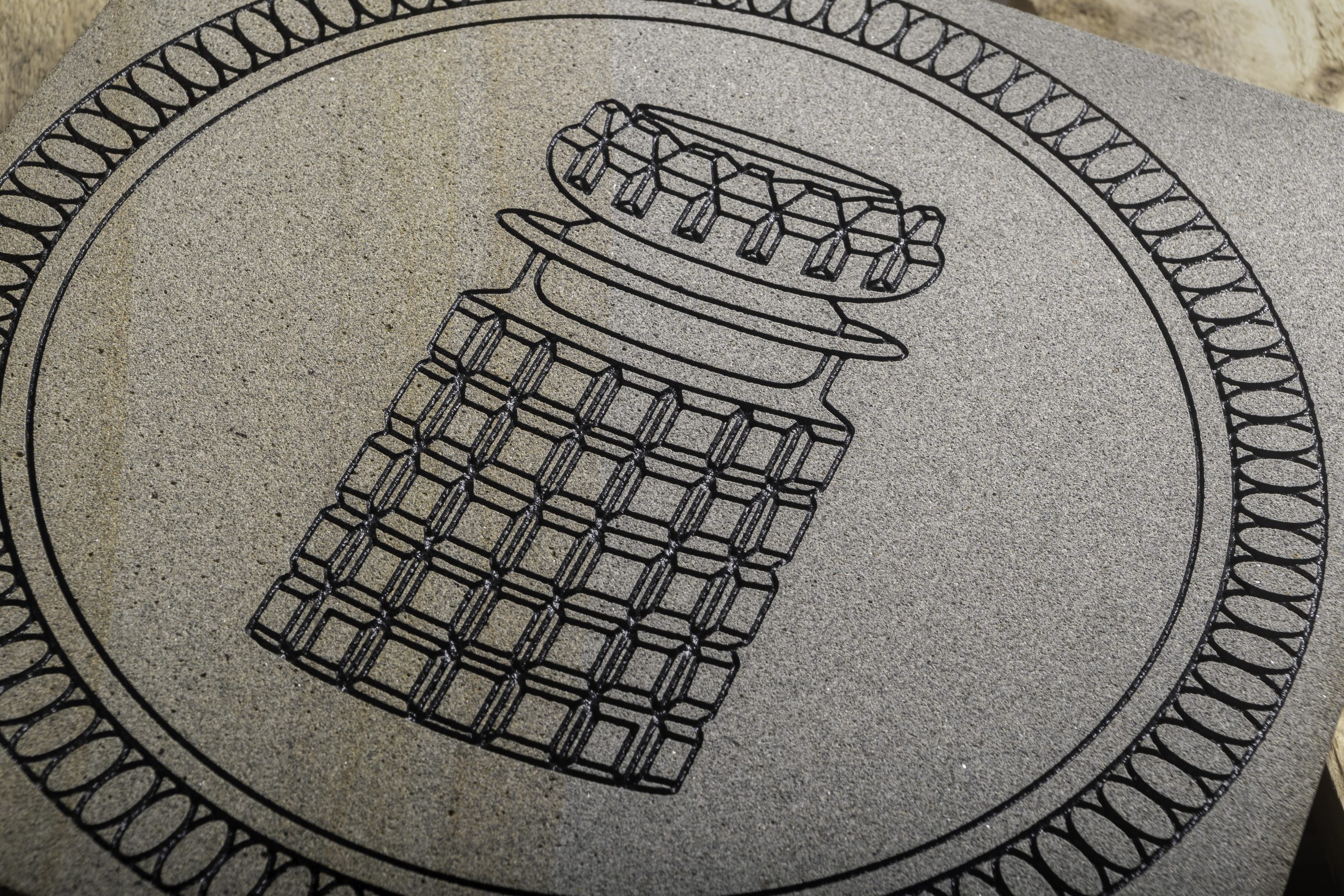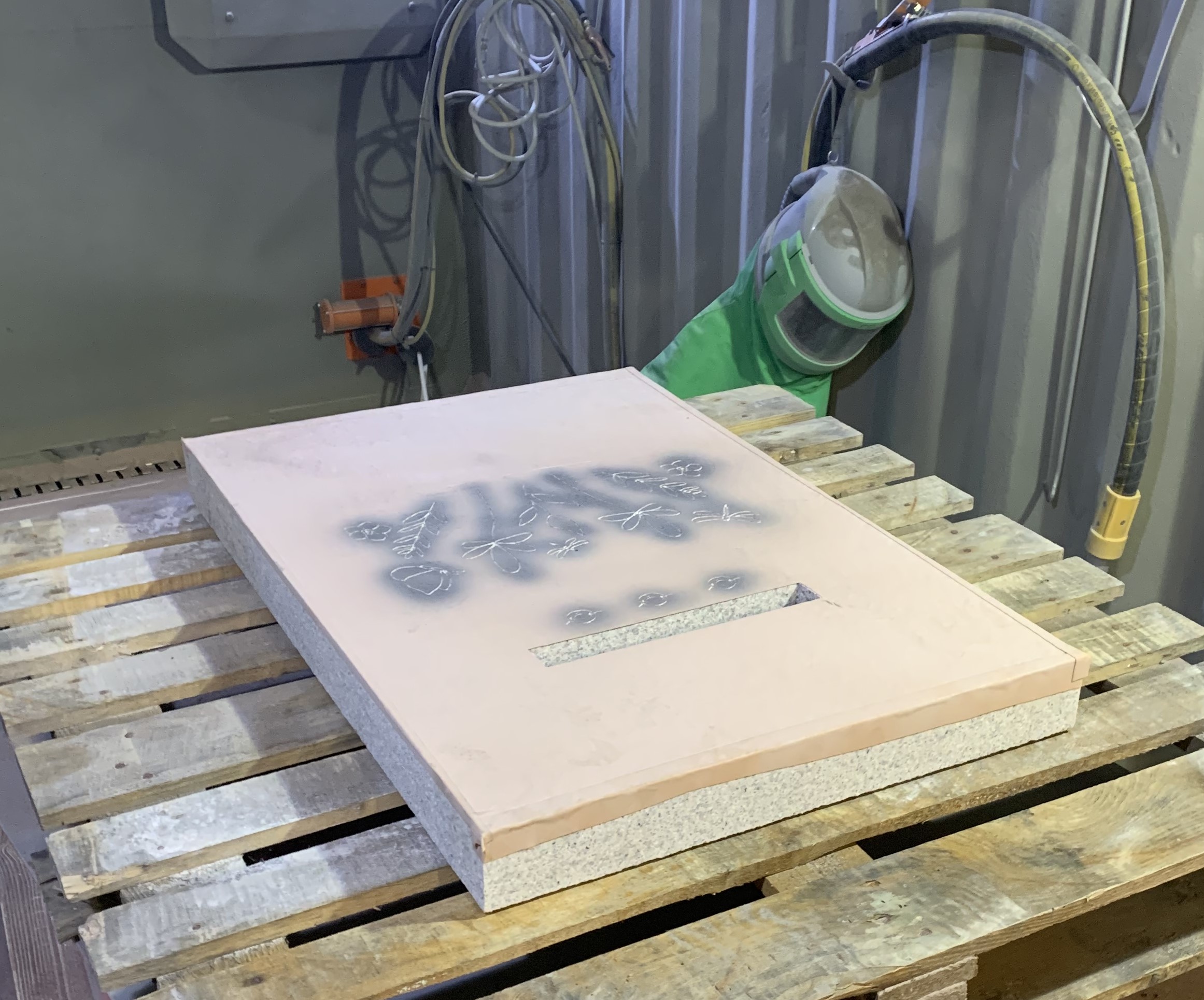 Sandblasting uses high-velocity abrasives to etch and texture natural stone, concrete, and metals.